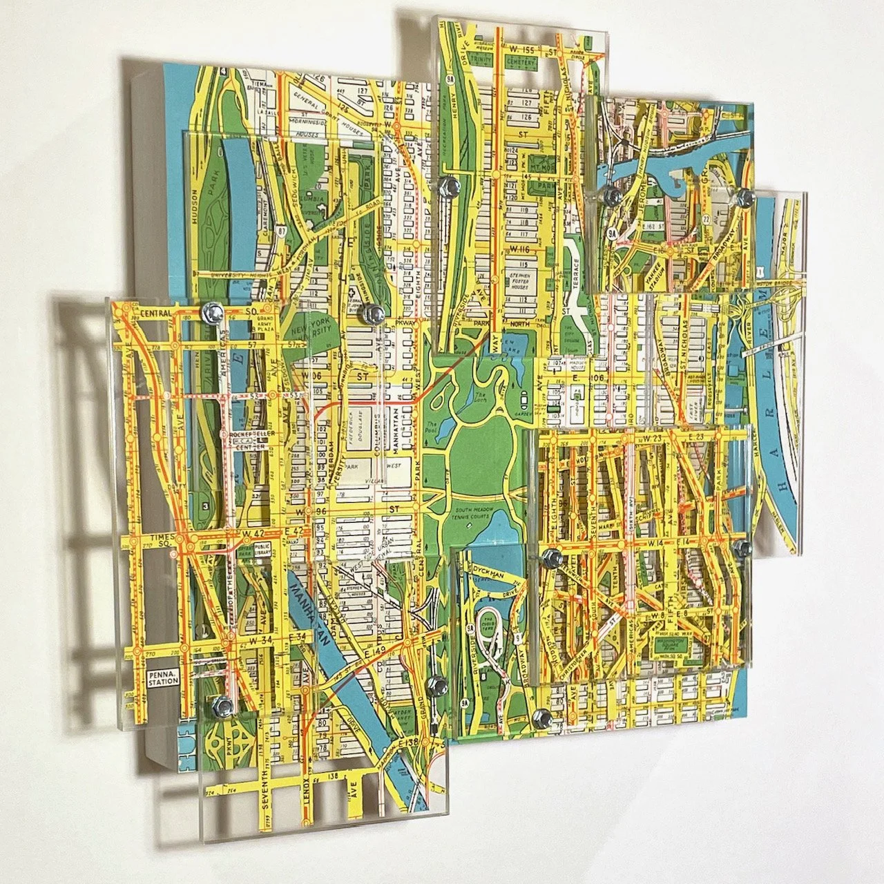 Midtown, 2025, Hand Cut Map, Acrylic, Metal on Panel, 17H x 15.5W